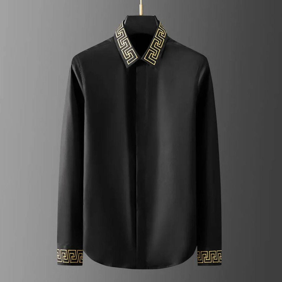 Neckline: Classic Pointed Collar with Gold Geometric Trim