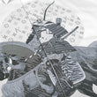 Design Theme: Samurai warrior on horseback with abstract moon emblem