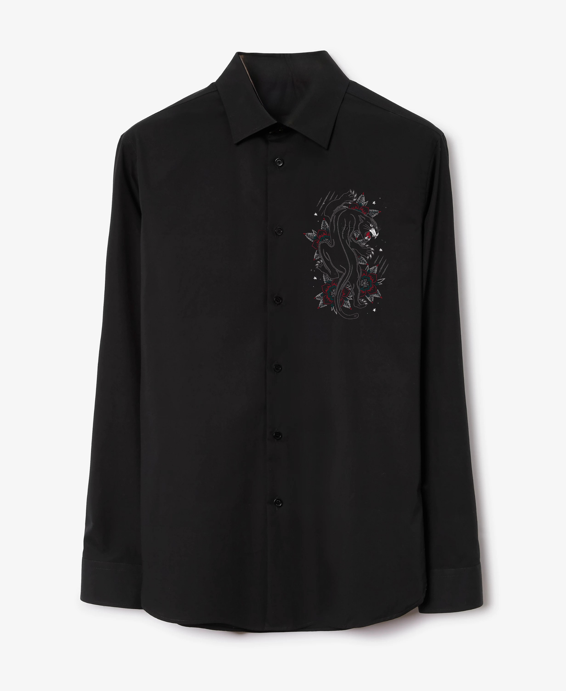 Design: Intricate embroidered lion with floral accents on left chest