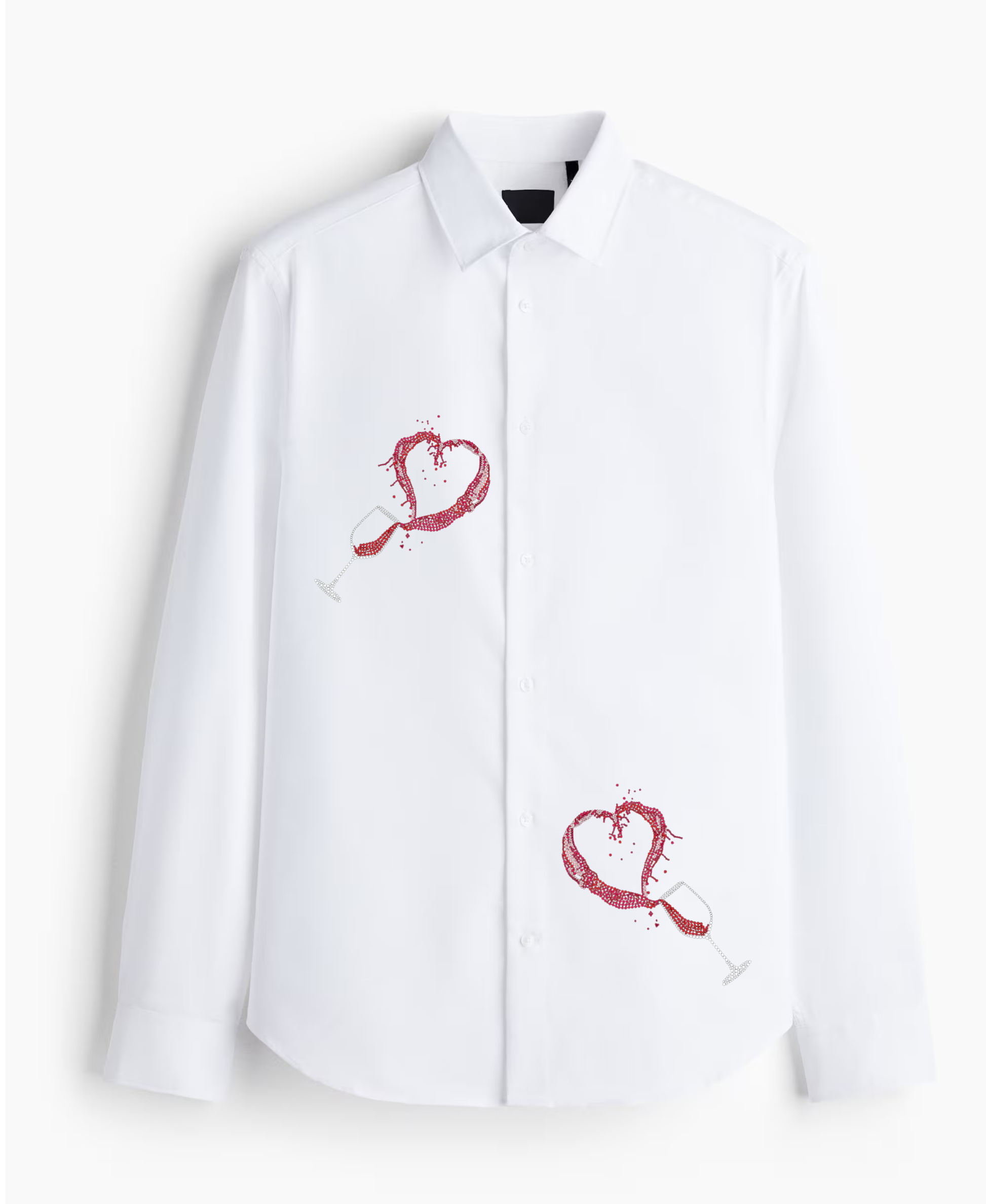 Design: Dual embroidered wine glass spilling into a heart shape motif on front