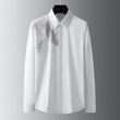 Design: Elegant long-sleeve button-up shirt with a striking rhinestone embellishment depicting Saturn and stars on the left shoulder and chest area.